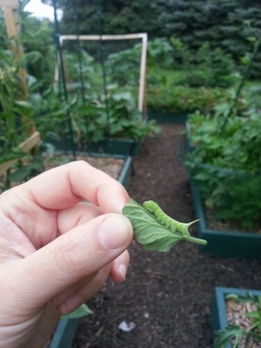 Lovely thing about “tomaticures” – besides how much easier the fruit should be to pick – is how easy it is to spot bad guys like the tomato hornworm. Leaves are spread out, scat is easy to spot, look up from scat, remove caterpillar. I’ve removed three this evening, all still very small.