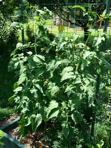And a not-so-complicated stake, to round out the post. Here’s my last tomato plant – no complicated staking for the Roma. It’s the only determinate tomato variety in the garden this year, so it’s only got a double-stacked cone cage.