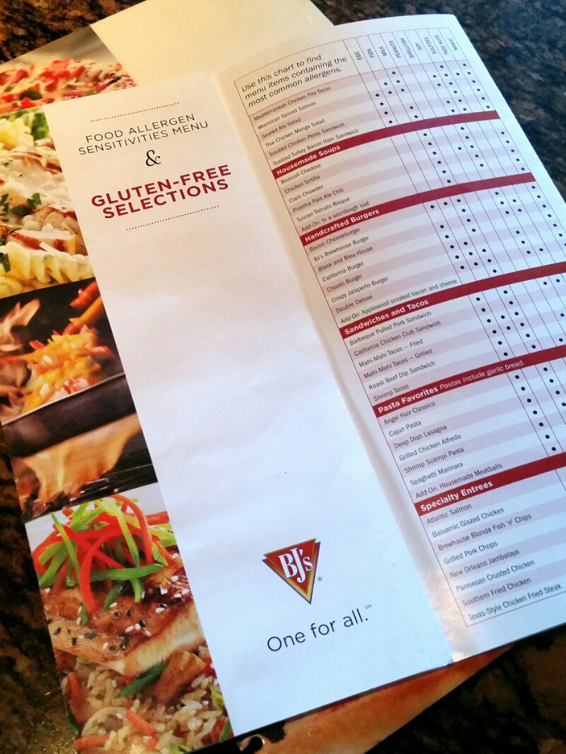 A shout-out to BJ’s Brewhouse for having a thorough gluten / allergen identification flyer for their patrons.  Although I’m now thoroughly depressed about the sheer number of items with dairy. And finding something which was wheat free and dairy free and, you know, tasty was challenging.