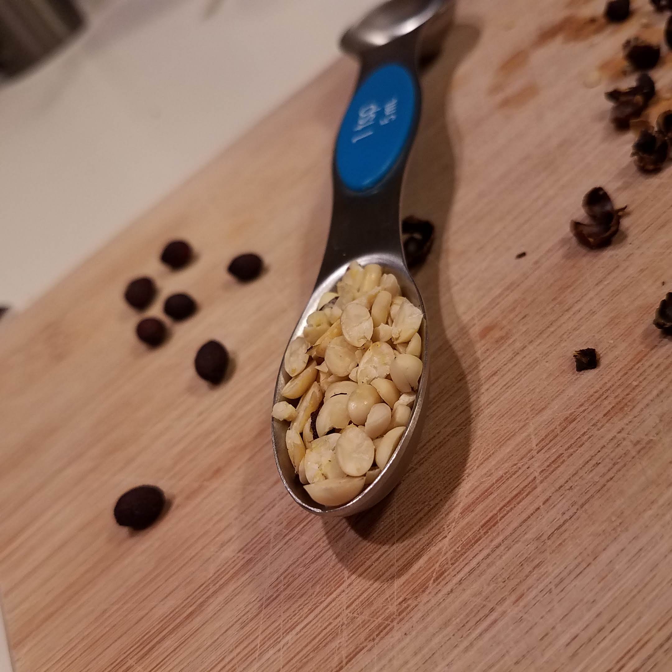 I went with option #1 which was slightly less tedious than you would guess. The seeds, though large, remain largely intact when the fruit is crushed gently with a tamper. This means they are relatively easy to separate from the rest of the fruit. I was surprised to discover that (despite appearances), seed and non-seed had roughly the same volume. A teaspoon of seeds left me with a pile of flaky brown bits that, once ground, also measured about a teaspoon. I was expecting it to end up with much less.