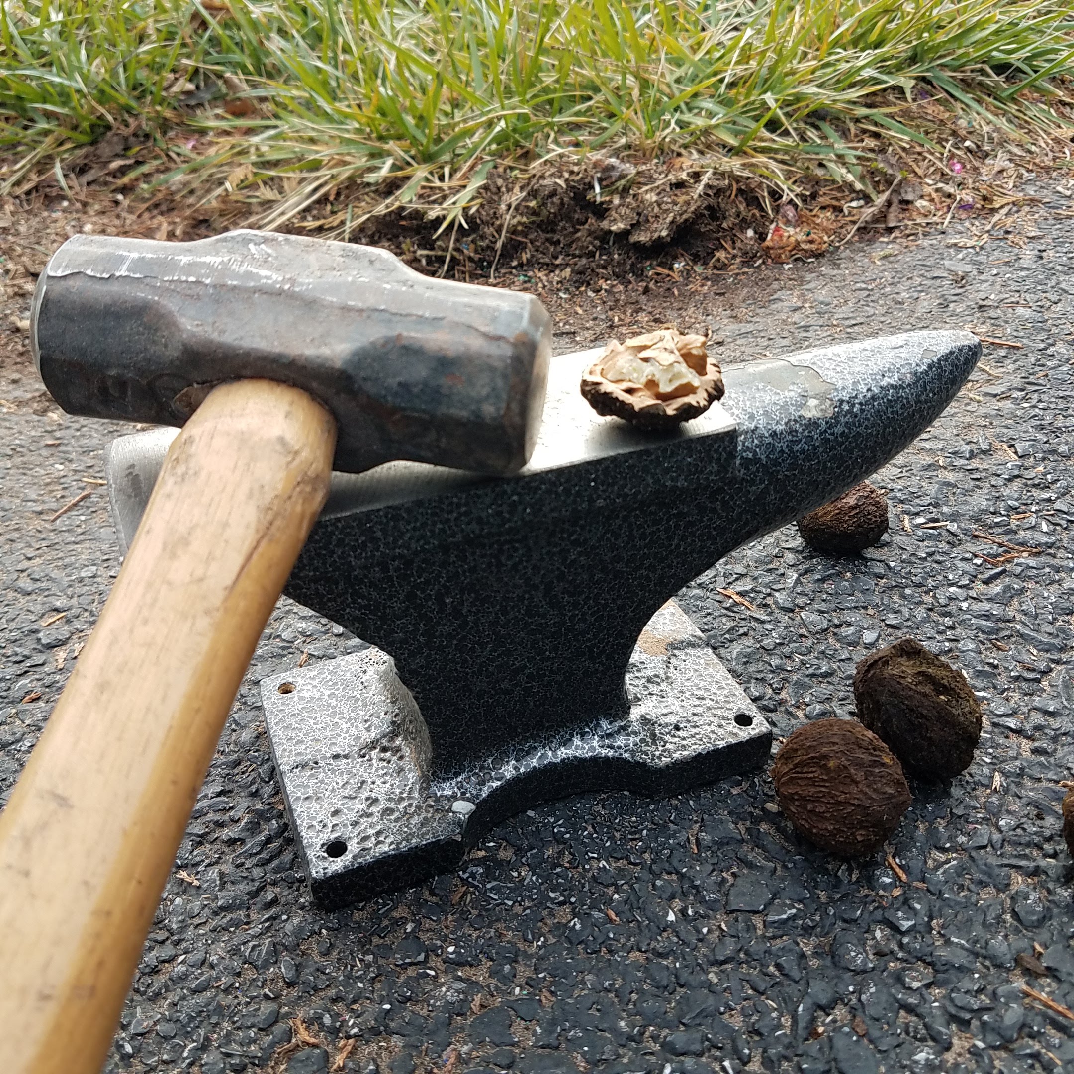 I still don’t have a “real” black walnut cracker. Rather than using the tamping iron like I had planned, I smashed the walnuts with a sledgehammer on a mini anvil, set in a cardboard box to catch the walnut shells and meat that went flying everywhere.