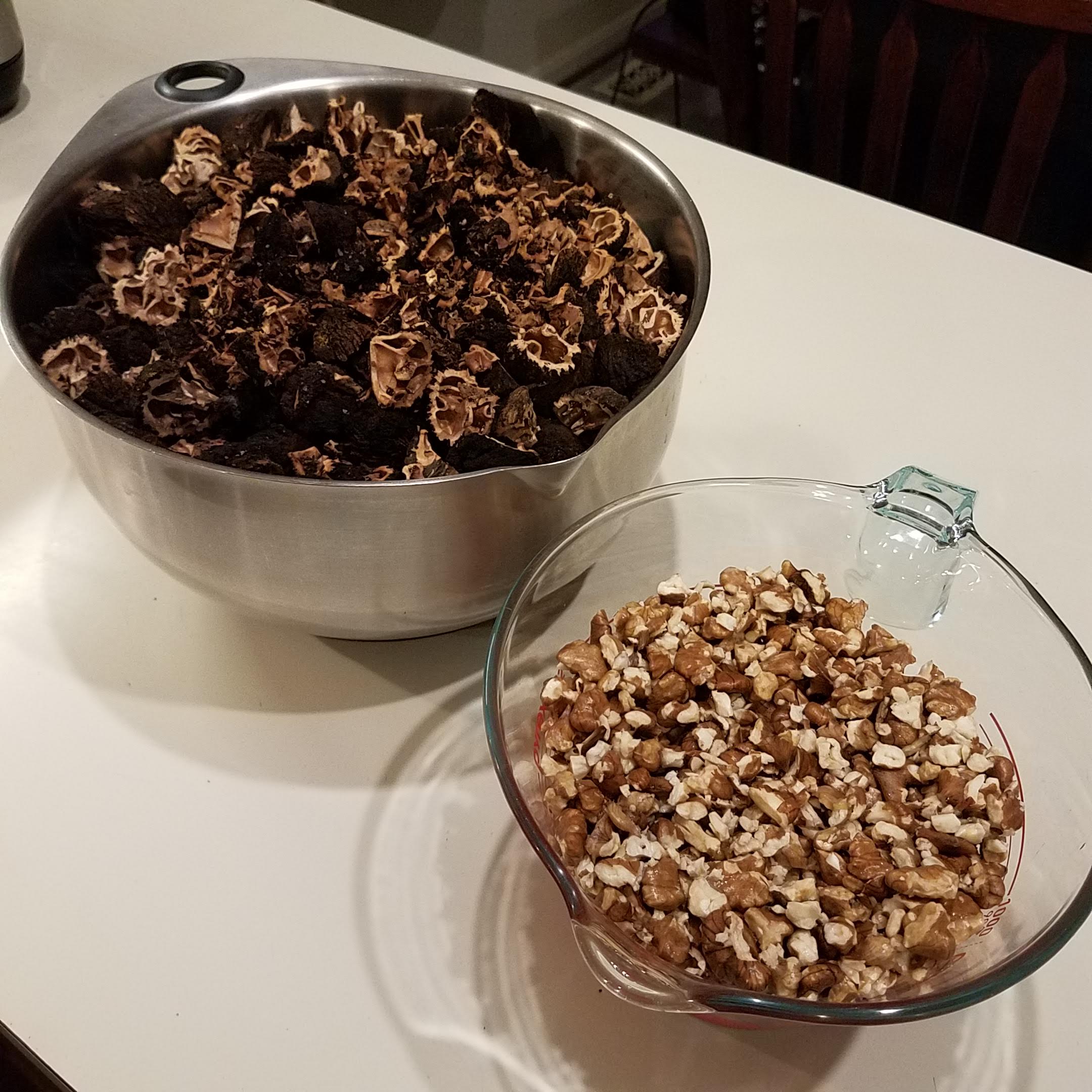 I tried the “floating nut” trick I had heard about last year. (Or was it two years ago now?) The black walnut pieces should float in a bowl of water because of the high fat content. Guess what! The icky black hull pieces float just as readily. So I resorted to the even more tedious task of manually picking out the good nut morsels from the not-good hull bits.