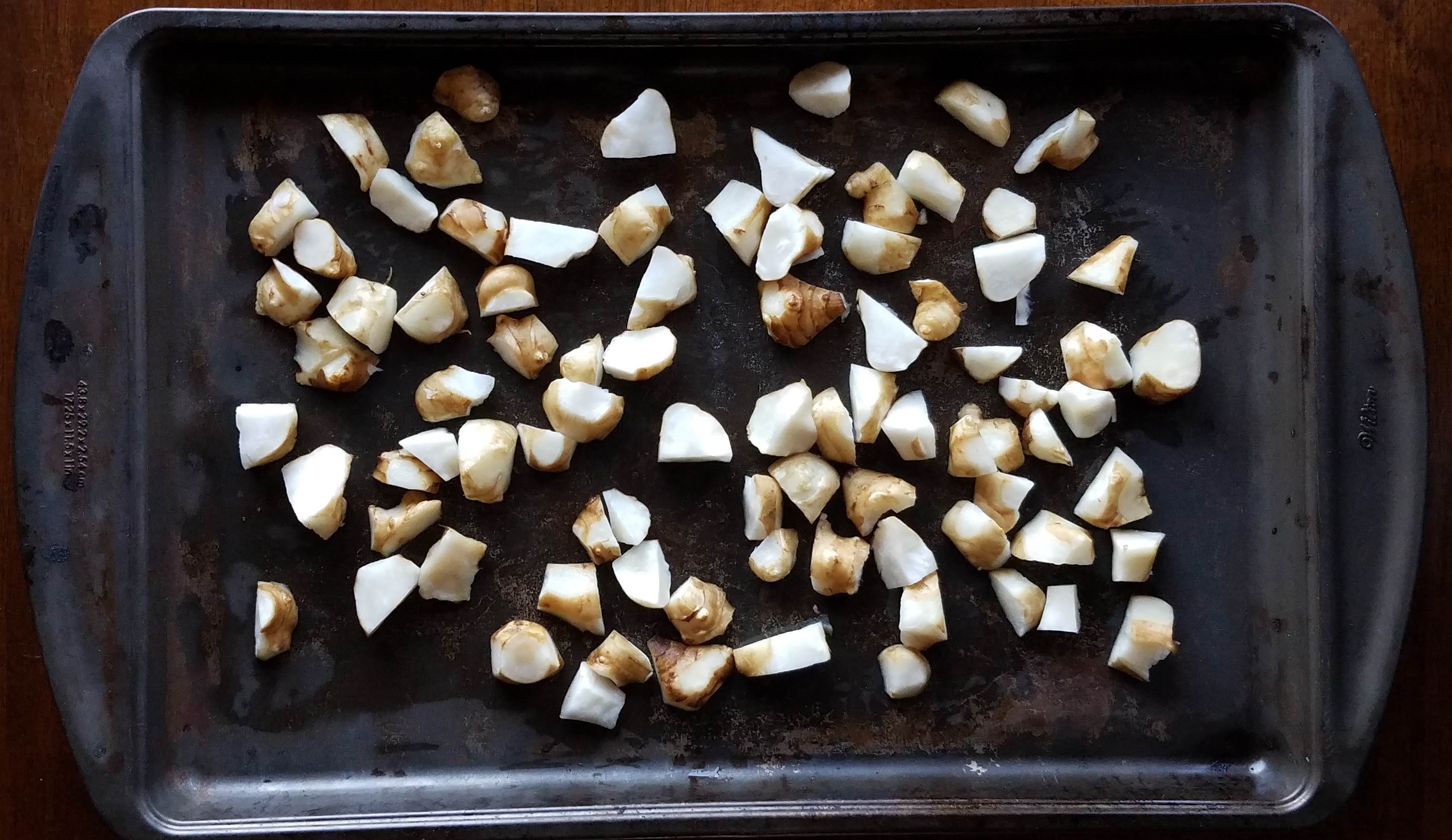 - Preheat oven to 400F. Toss drained sunchokes with oil, and roast in the oven for 30 minutes, stirring occasionally.
