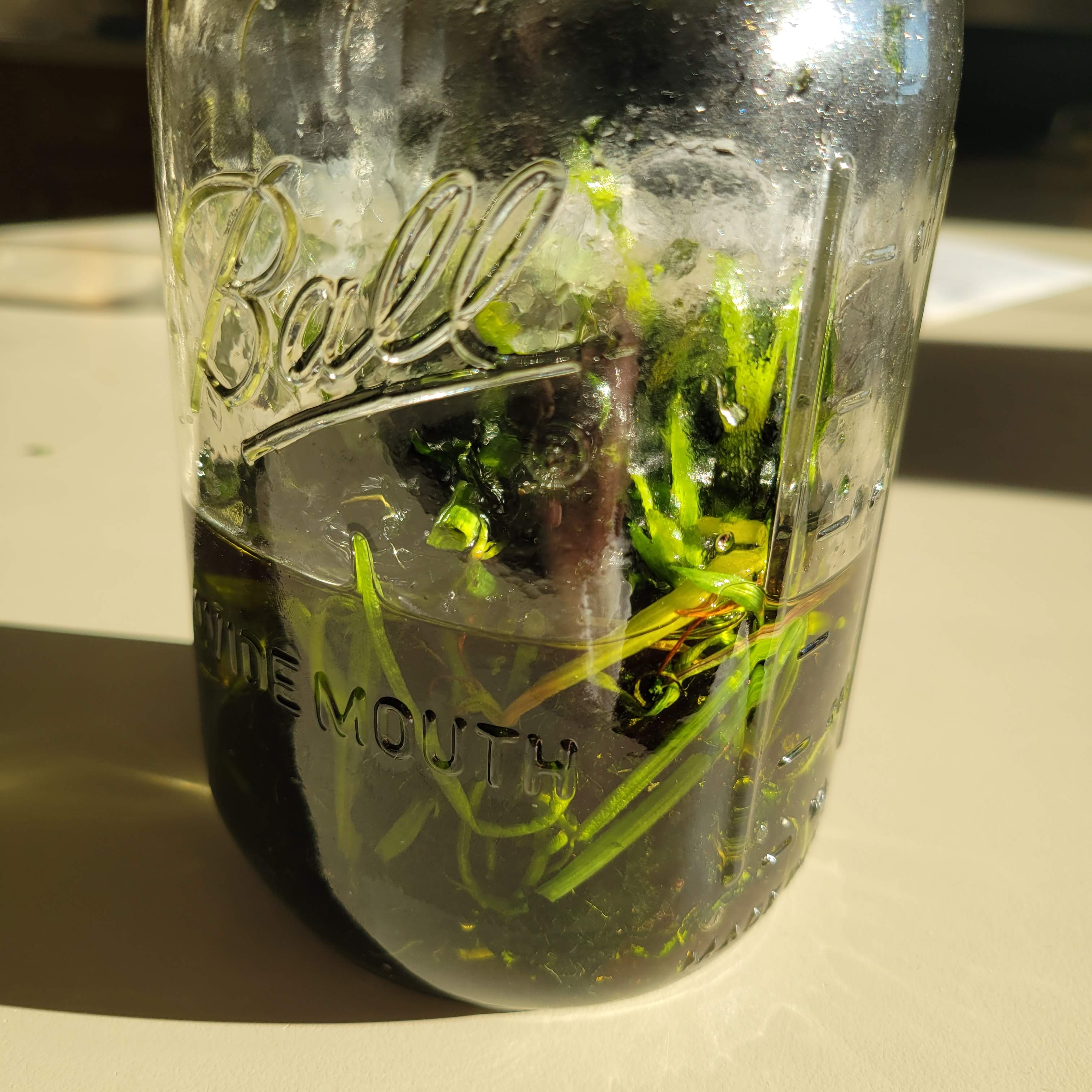 For this batch, I opted for a cold infusion. For the cold infusion, I just place the dried-ish plant parts into a glass jar and cover them with the carrier oil, and allow them to infuse for … you know. A while. I am not terribly scientific about any of this, as I’m still playing, er, learning. This approach offers two main benefits. First, there’s no additional energy required to infuse the oil (either through the oven or stove-top). Second, there’s no risk of overheating the oil and plant matter and possibly losing any phytochemicals which are heat-sensitive. The biggest disadvantage is having to wait a longer time for the oil to infuse.