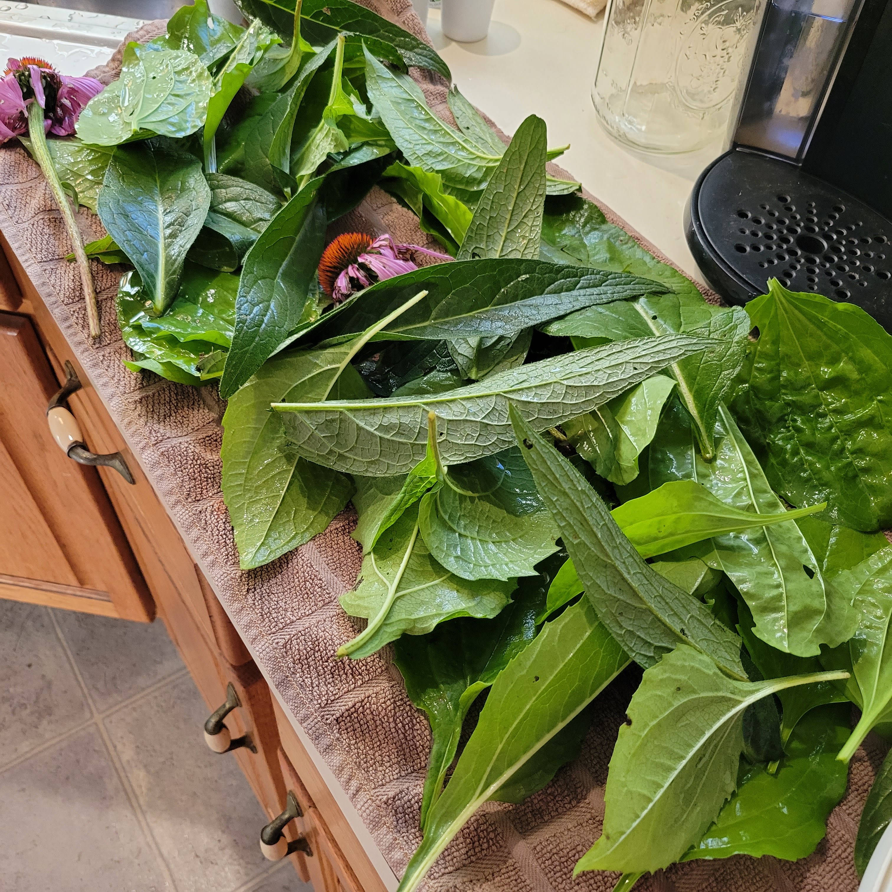 Comfrey (Symphytum officinale). 28 grams leaves. Leaves and roots heal skin and are especially good for minor abrasions like scrapes or scratches from thorns (or prickly-stemmed plants like zucchini). I only harvested leaves because I didn’t feel like digging up roots!