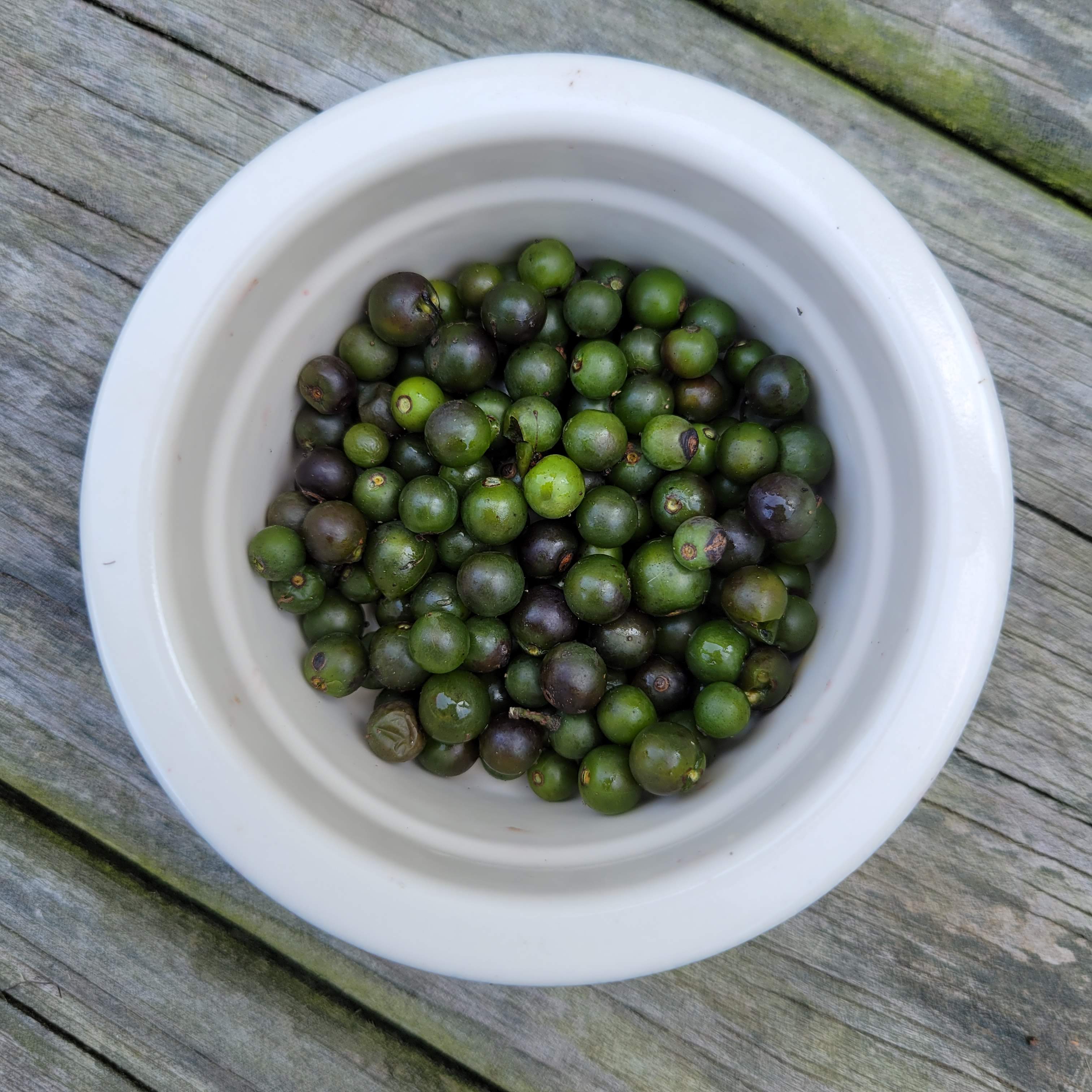 Picking the grapes off the stems was tedious, but no more so than many other things I have done in the name of wild food: processing sumac drupes, cleaning elderberries, winnowing amaranth, or most recently, trying to extract enough black cherry kernels to try making mahlab. (No, I still don’t have enough!) I did not use gloves, because I wanted to see whether the acid levels really were so bad I would feel it on my skin. However I didn’t get enough juice on my hands to make a fair assessment. It did sting mightily when the juice got into a cut on my finger though.