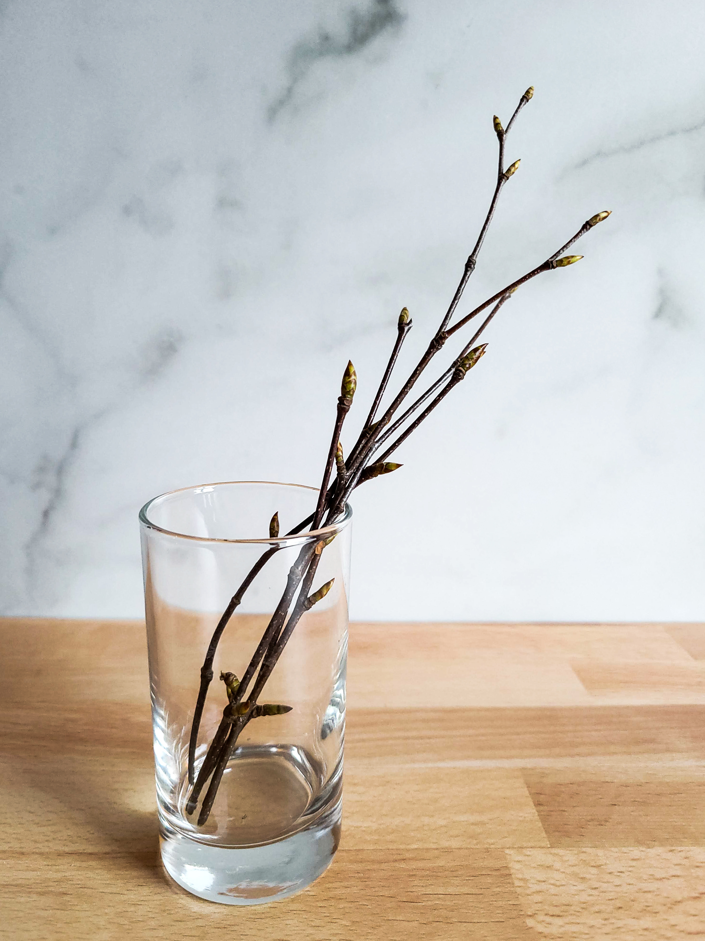 I followed the birch extract directions I found online here. The author doesn’t say anything about peeling the twigs, but I chose to take the additional time to expose more of the inner bark. Unlike processing some wild edibles (gingko nuts and black walnuts come to mind) processing birch is pleasant. Scraping sweet birch bark off the twigs leaves your fingertips pleasantly mint scented. Alternatively, use the edge of a paring knife (carefully) if your fingernails are weak.