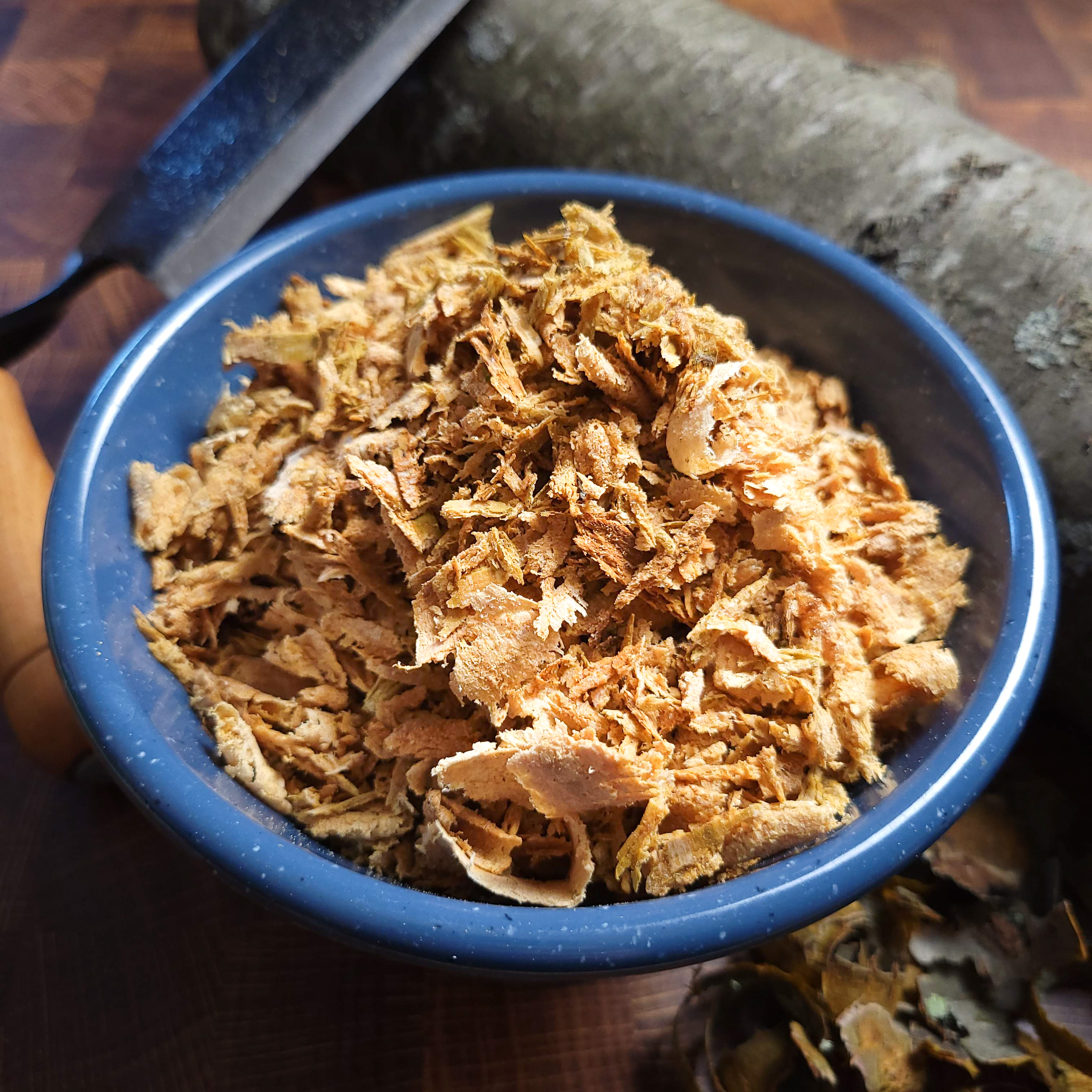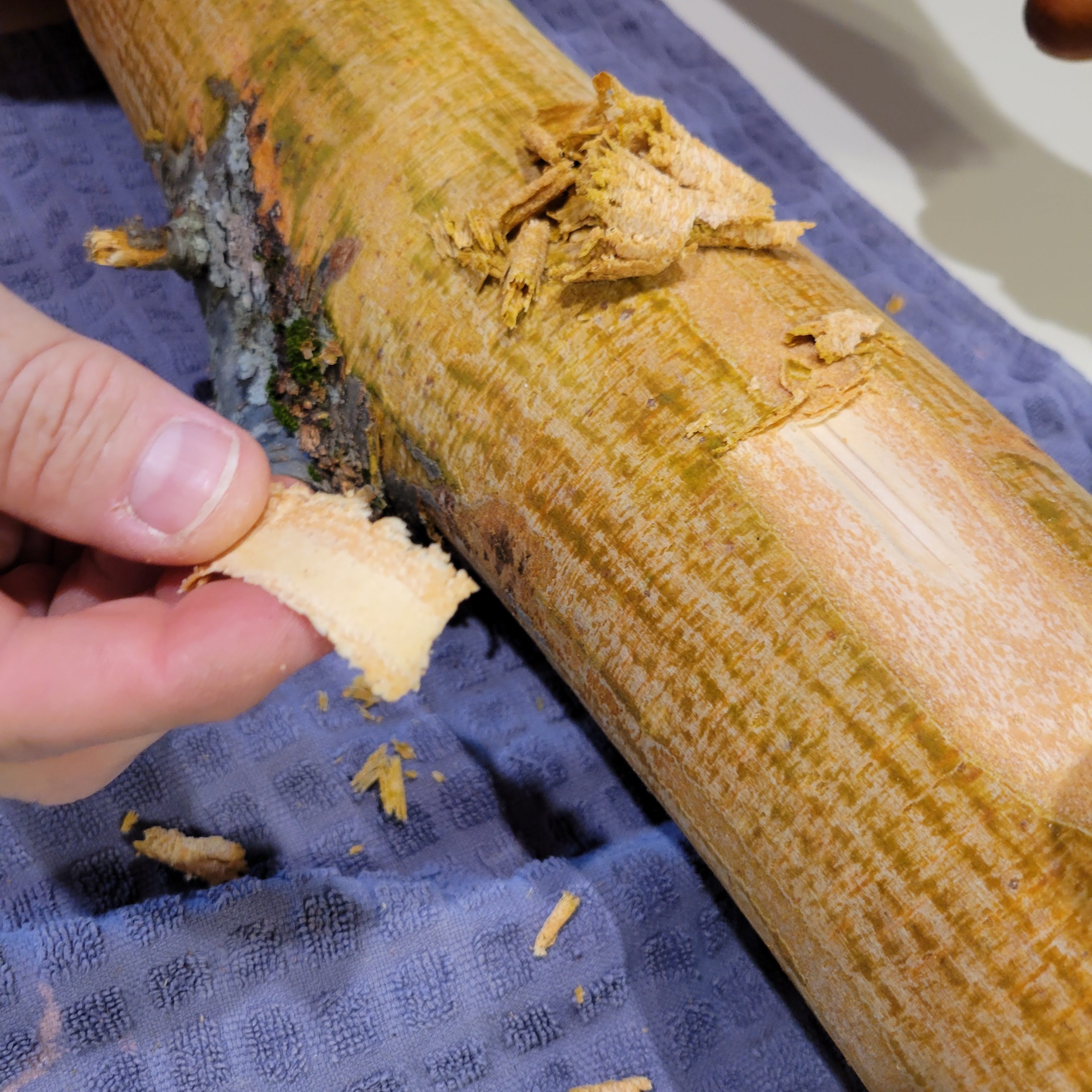 The inner bark comes off in crumbly pieces, rather than the curls of the outer bark. When the drawknife produces curls again, you know you’ve gone too deep and have passed the edible layer. The color also changes from yellow to a paler tan color.