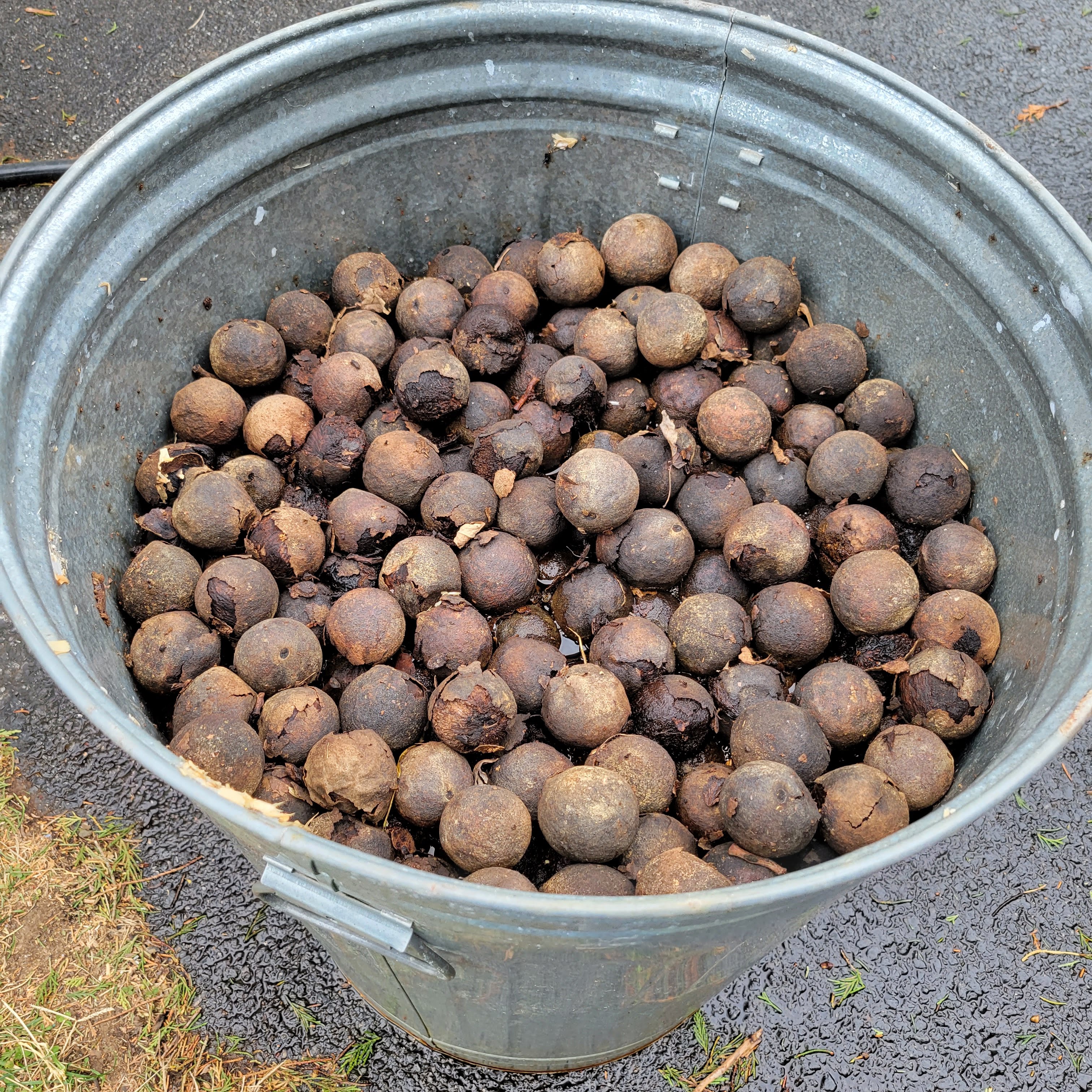 At which point, the hulls were almost completely black and falling off of their own accord. I have heard repeatedly that the leaving the hulls on this long would change the flavor of the nutmeat within, but I couldn’t waste this generous gift. Using the same technique we tested out a few months ago, we (OK, my husband) transformed an almost-full garbage can of walnuts….