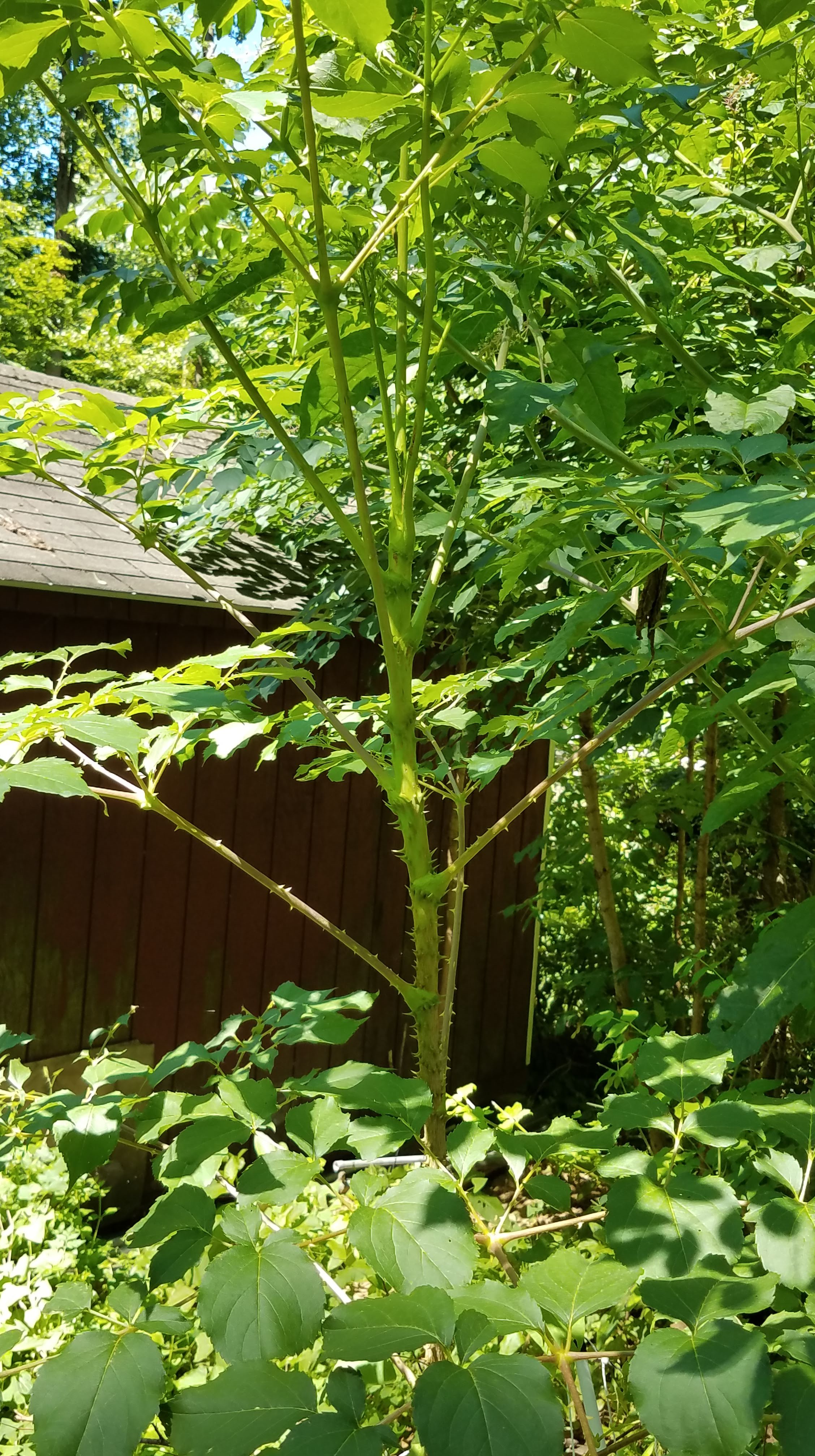 Oh, then there’s also Aralia spinosa – no relation – known primarily as Devil’s walkingstick, which is sometimes also called prickly ash. But you can see from this photo (taken a few summers ago) that the spikes on A. spinosa are very, very different from Zanthoxylum spp.