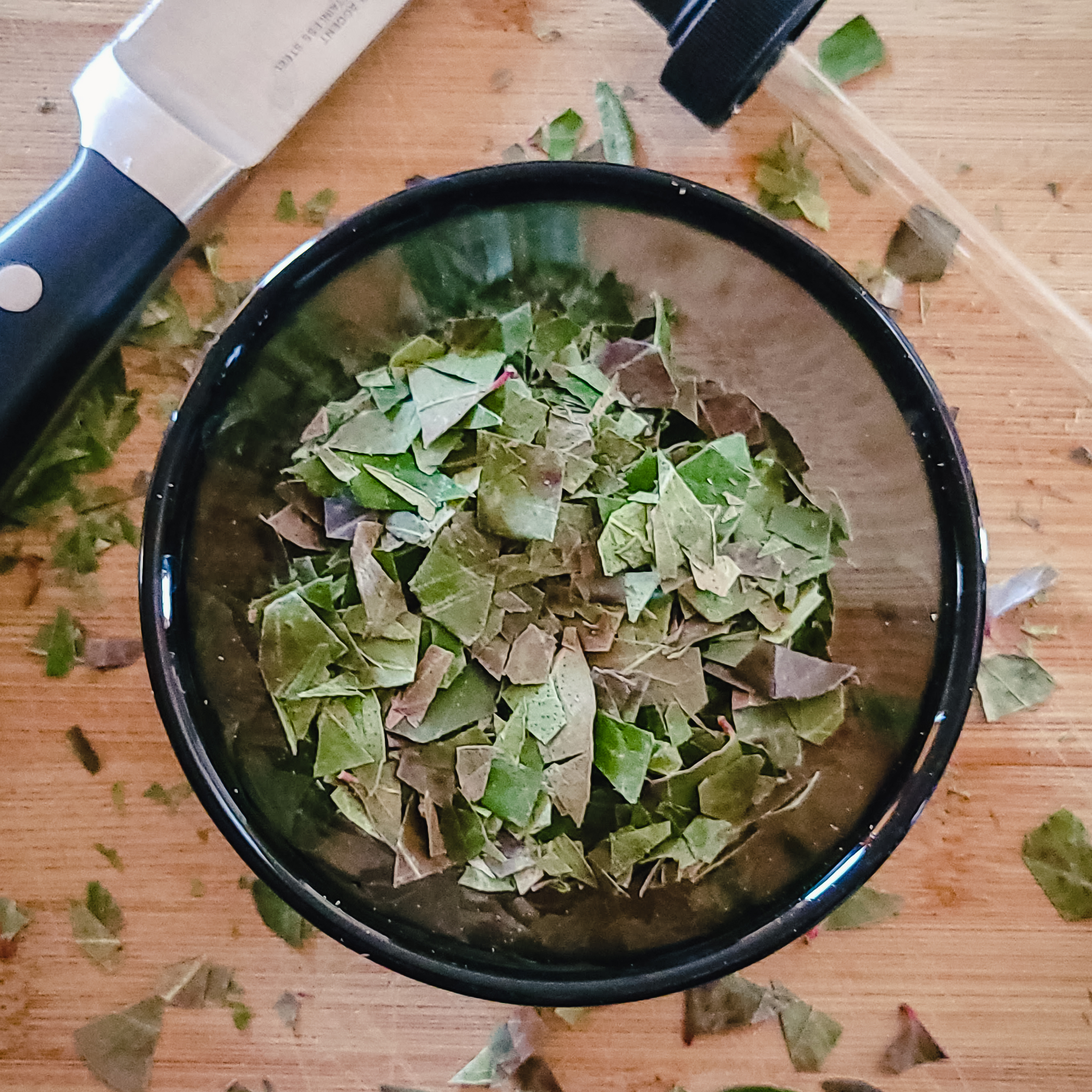 I harvested 20 grams of Eastern teaberry leaves, and allowed them to dry for several days to reduce their moisture. Excess water in an oil infusion can cause the oil to go rancid more quickly. The weight after four days dropped to 9 grams. I roughly chopped the leaves, then divided the fragments between a sweet almond oil infusion for a muscle salve and a high proof alcohol infusion for wintergreen flavoring. (To compare against the sweet birch (Betula lenta) ‘wintergreen’ I made a few months ago.)