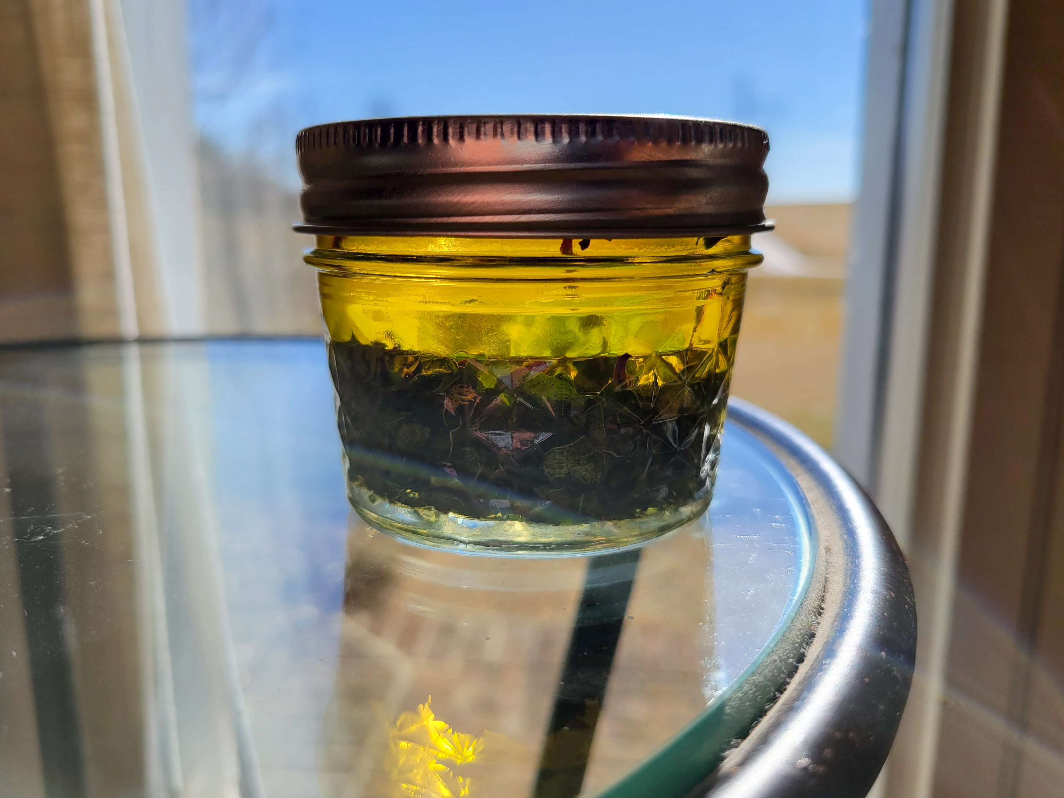 I set the tiny jar of oil in a sunny location. The sources I read online suggested the gentle warmth of the sun through the glass jar, plus time, would be sufficient to extract the medicinal phytochemicals from plant matter (generically speaking). Often they suggest refreshing the material after a few weeks for the greatest strength but I’m not sure when I’ll be able to harvest more leaves. (Gas prices, you know?)