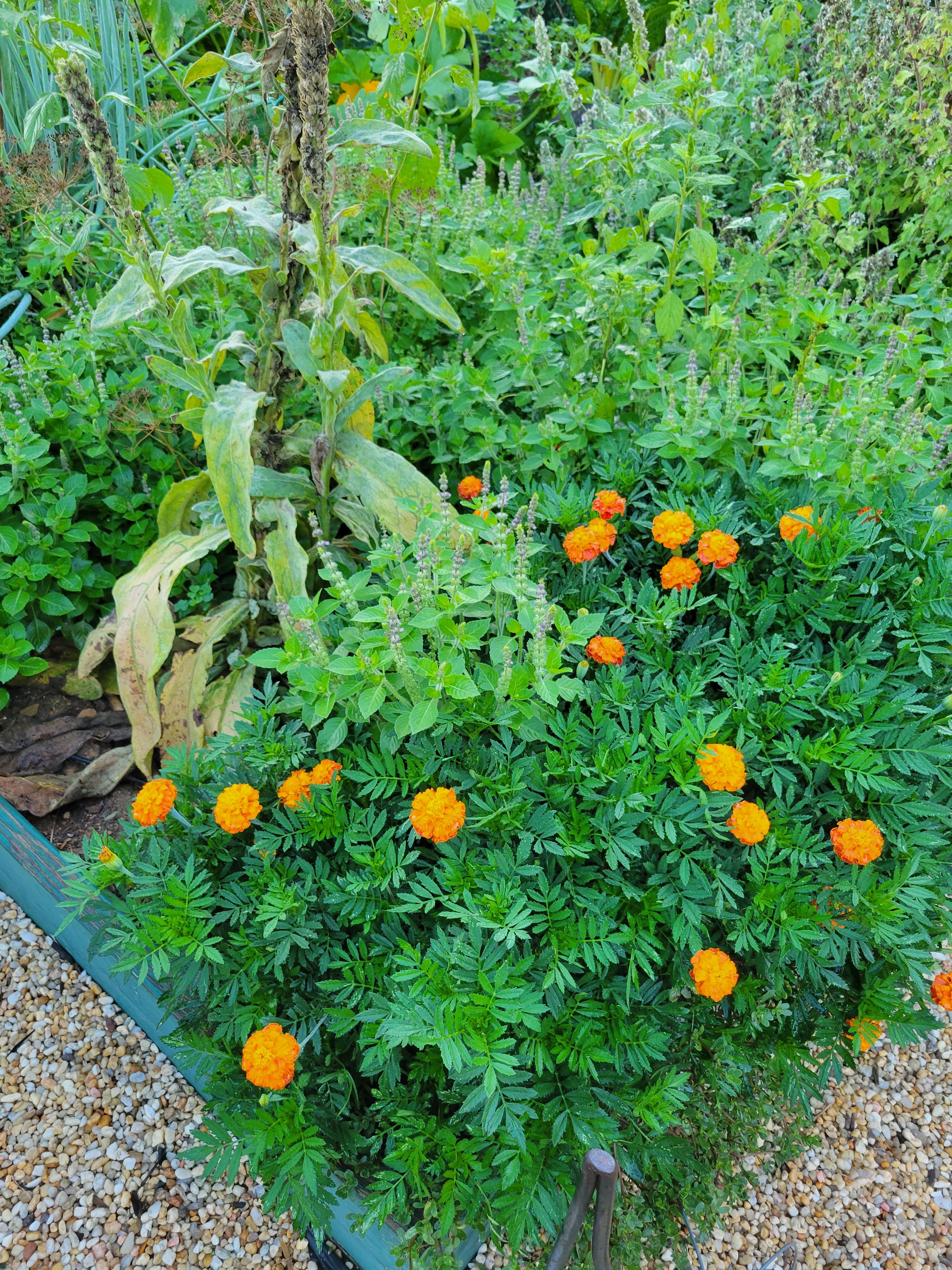 Say welcome to the weeds! The only thing I planted in this box can’t even be seen for the “volunteers” crowding every space. Most of the plants are actual “crops”. The marigolds self-sowed from last year’s flowers. The holy basil, well, the holy basil has found every possible opening in my garden. The amaranth, while wild, has been encouraged for several years. The one “crop”, a mammoth dill, is hidden behind the real prize of this bed: greater mullein.