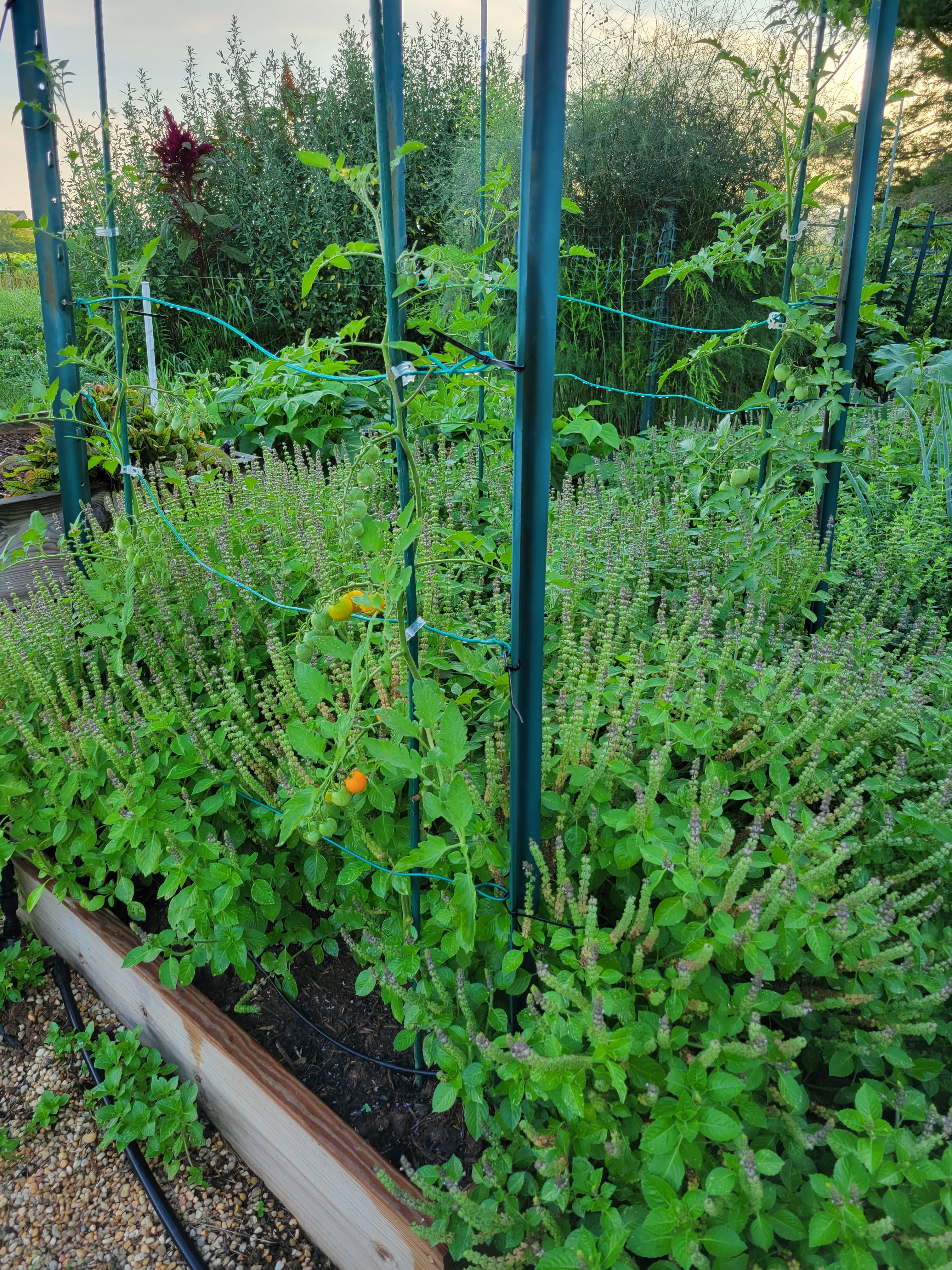 Does intercropping holy basil help the tomatoes grow via companion planting? No idea. Maybe they help attract pollinators. Or maybe they encourage fungal growth because the soil can’t dry out under all that ground cover. I guess time will tell.