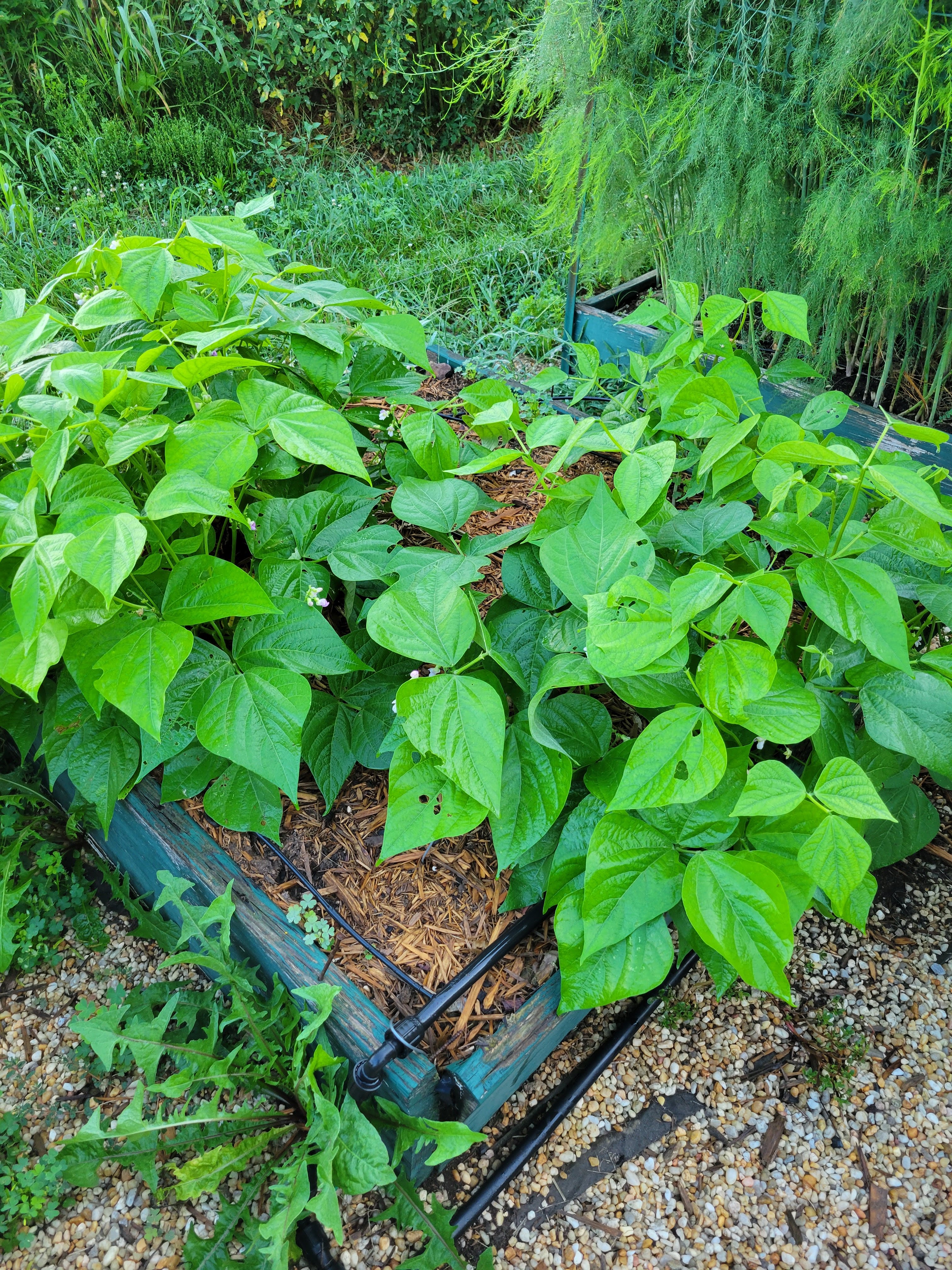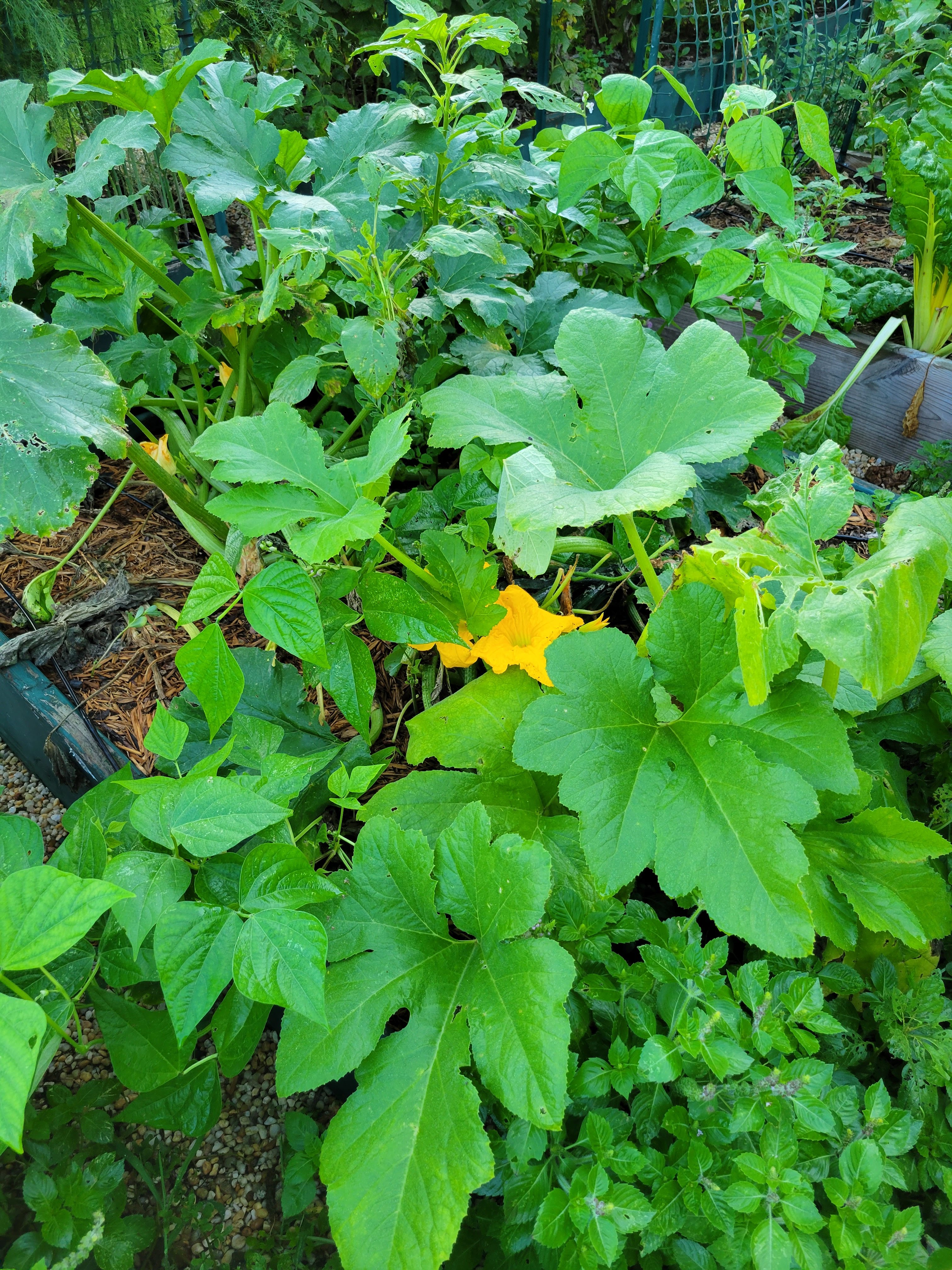 By the way, this is another bed with the ill-conceived placement of bush beans between the squash plants, like in C2. Here you can still see how the beans are struggling to find room enough to even exist. I will not make this particular intercropping mistake again.