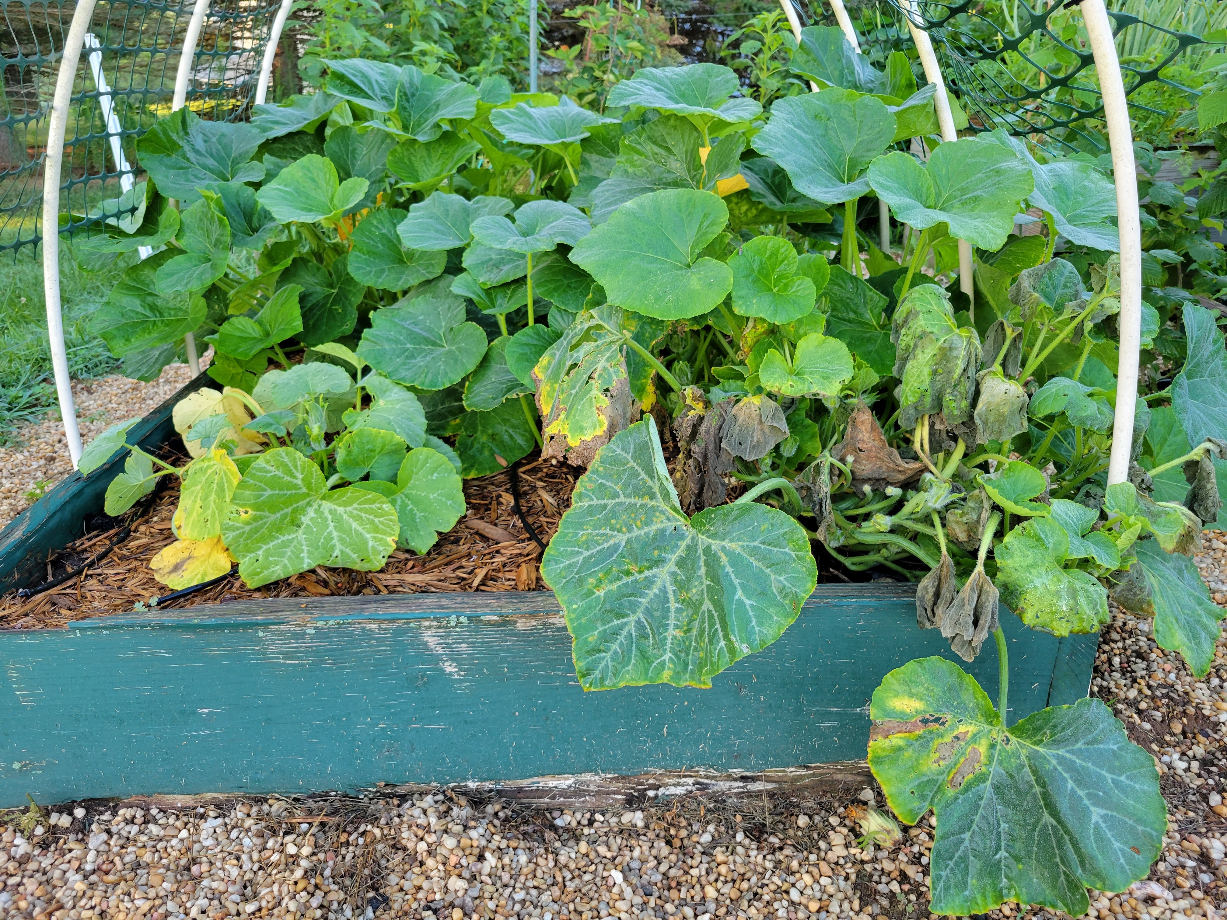 Unfortunately, these squash plants appear to be suffering from what I call “non-specific failure to thrive”. In other words, they aren’t doing well with no obvious explanation.