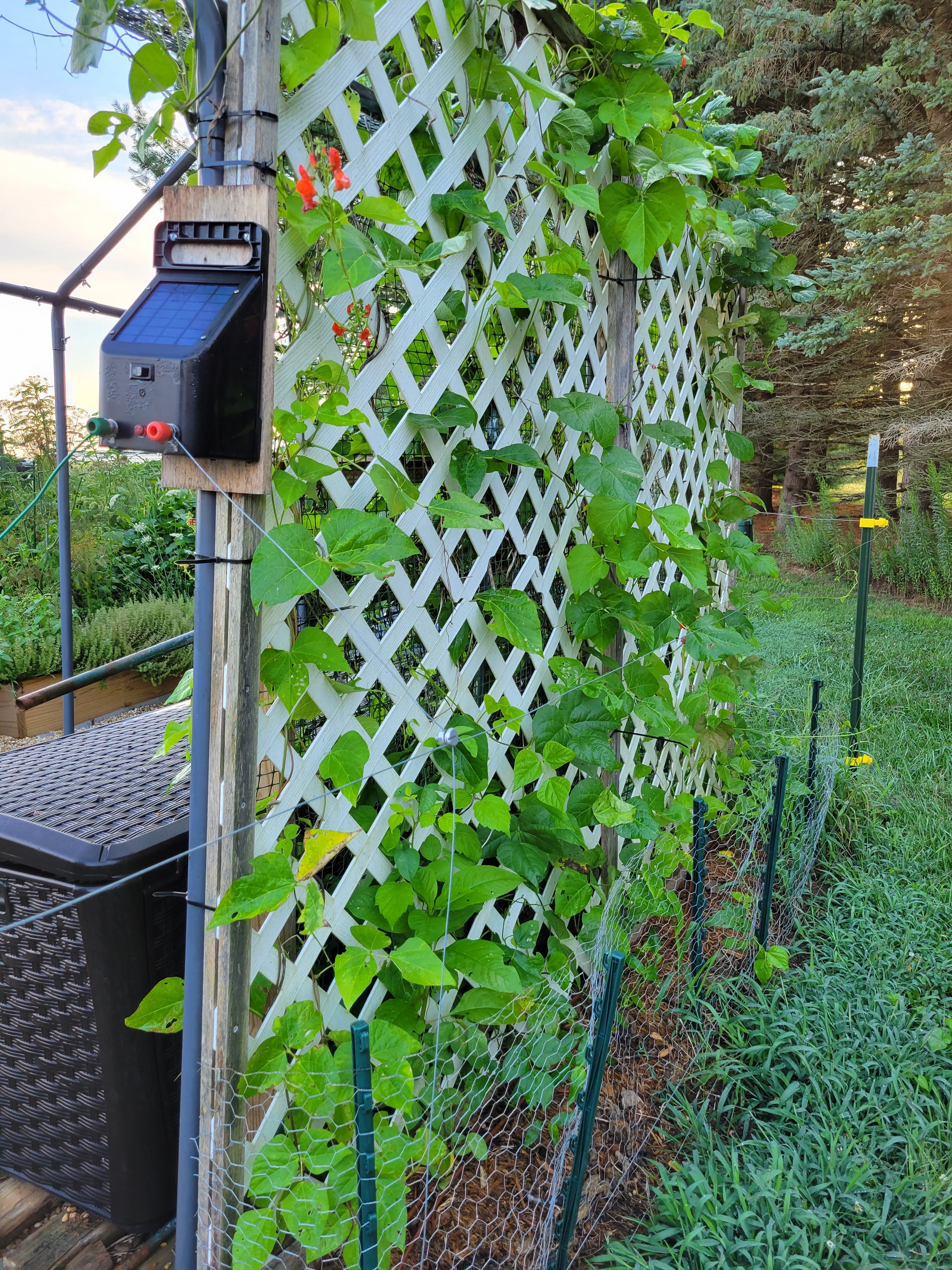 The garden trellis is built on the frame of what used to be a cheap plastic greenhouse. The “canvas” long since ripped to shreds, but the metal poles support plastic pieces which provide the perfect playground for vining plants. This year: scarlet runner beans.