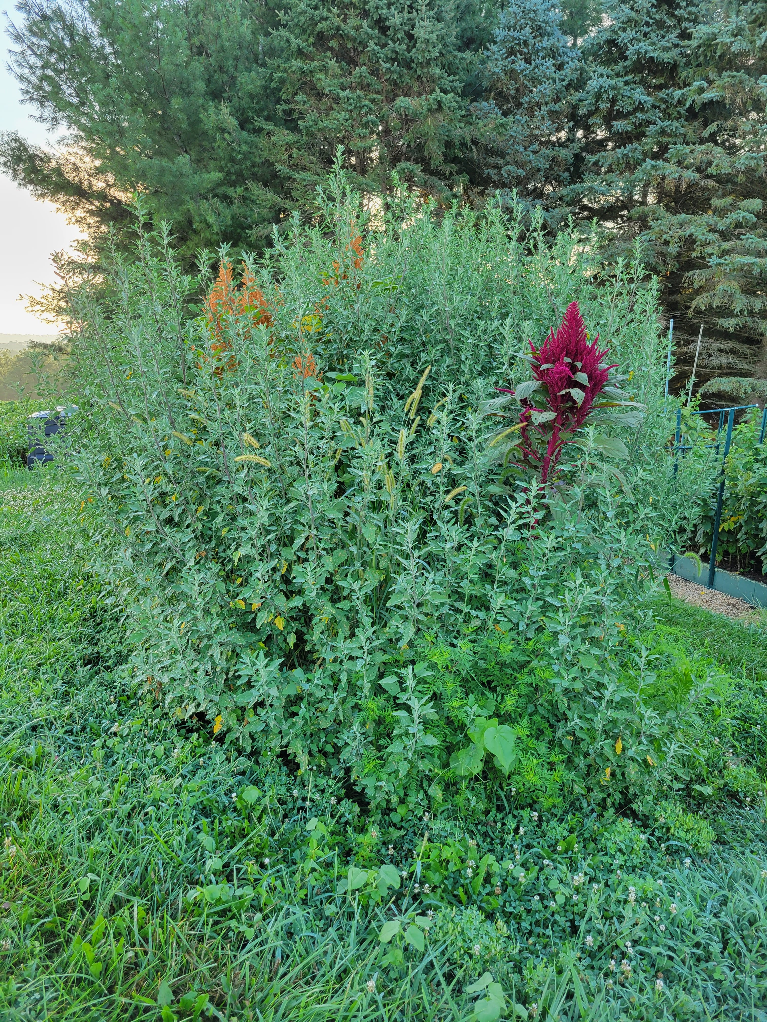 Somewhere under all that biomass is the hügelkultur bed I started a few years ago. I didn’t design it very well, and its primary purpose was to use up downed tree limbs. Now it hosts nothing at all but weeds. Er, volunteers.
