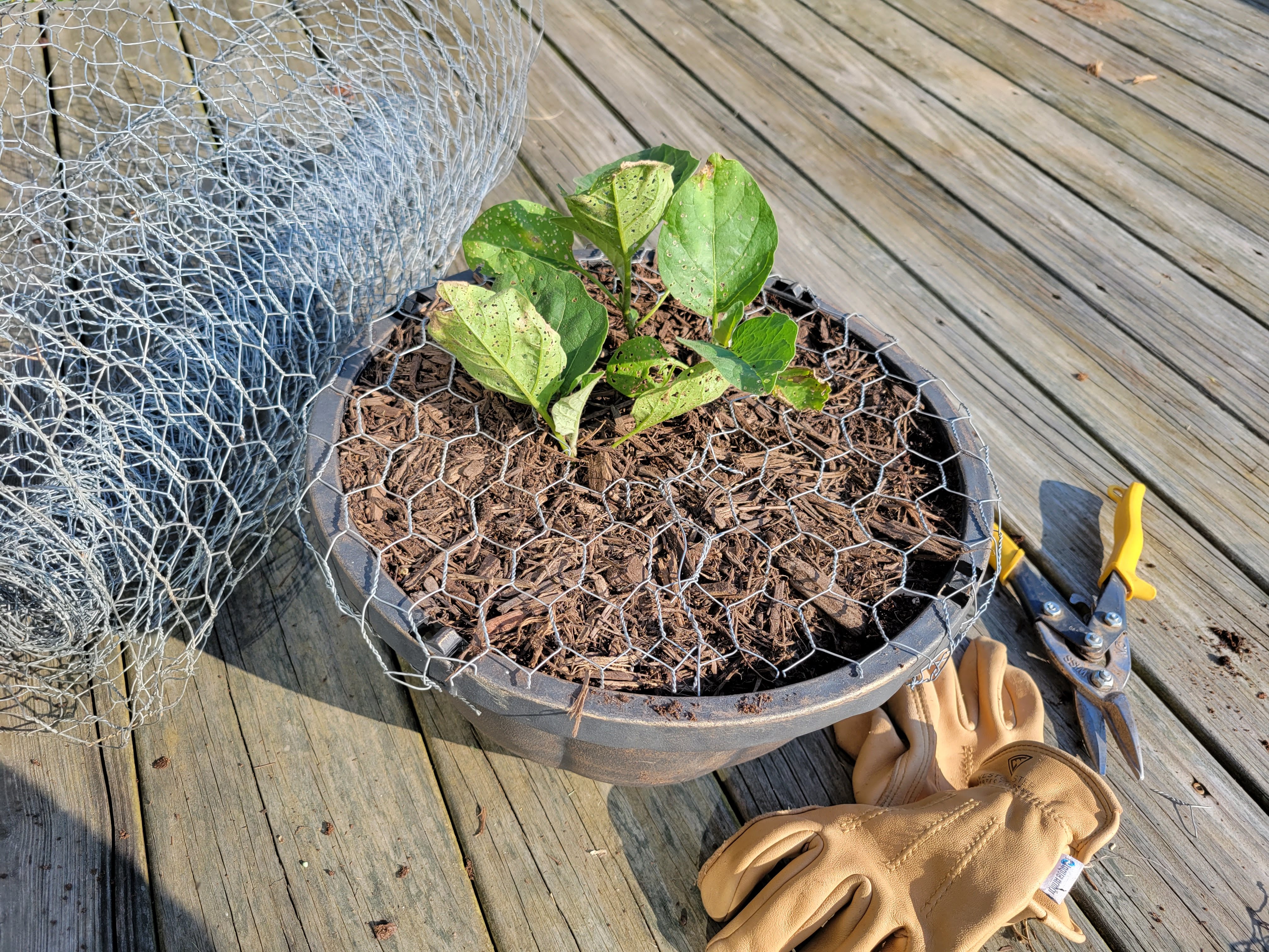 Mind you, the eggplants still needed to be protected from digging squirrels. The pots feature chicken wire covers to dissuade furry paws. This photo from earlier in the year shows how the wire is shaped over the top of the pot. A hole cut in the center of the wire leaves room for the stems to grow larger as the plant matures.