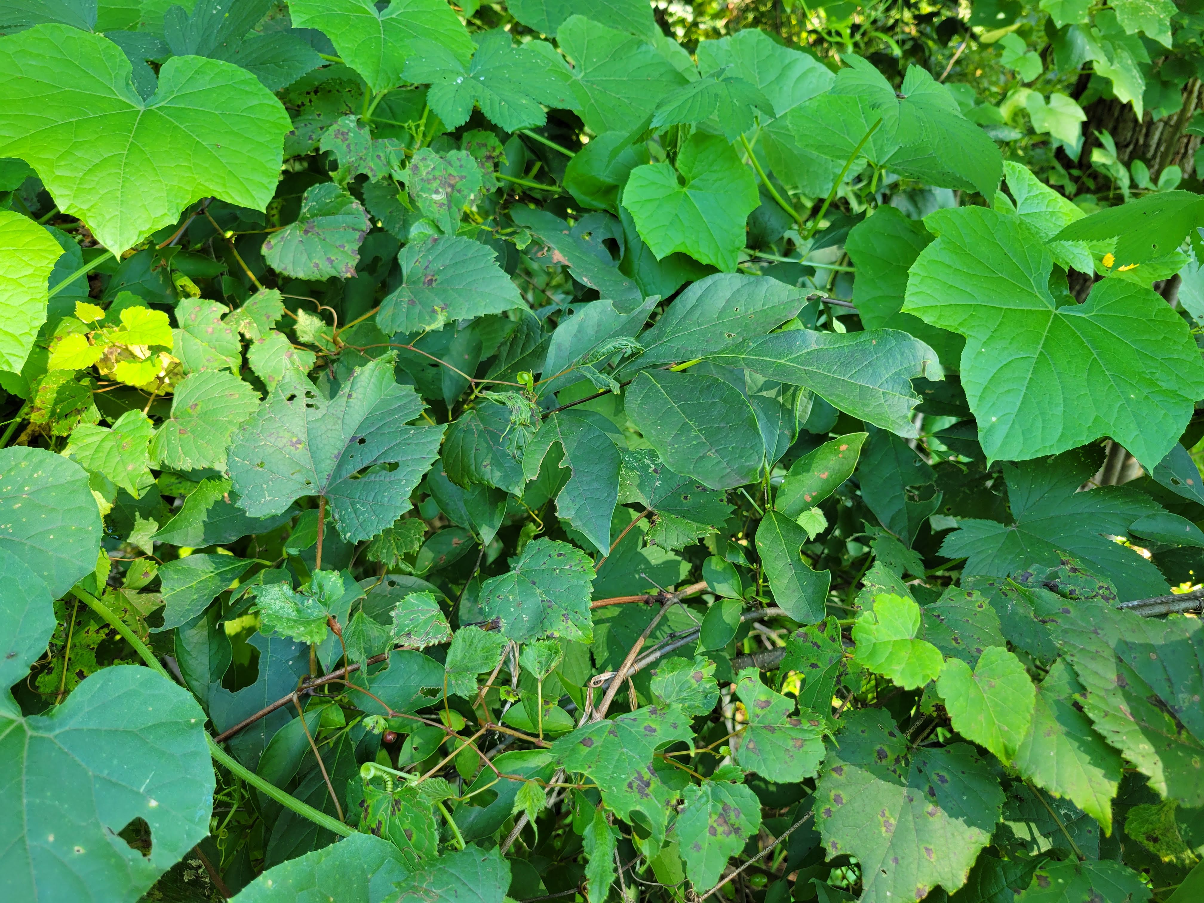 The moonseed leaves sport the lighter green color around the edges of the photo; the wild grape is the darker green in the center left. You can see the difference in the stems, with the light green (example lower left) stem for moonseed and woody brown (starting at the lower left and moving towards the center) for the grape.